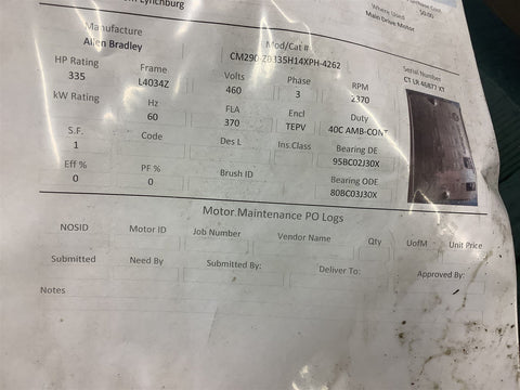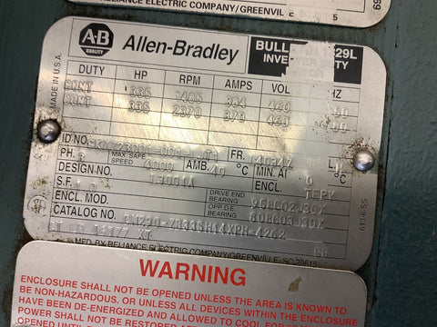 Allen Bradley CM290-ZB335H14XPH-4262 AC Motor 335 HP 460 Volts 4034Z Fr 1485 RPM