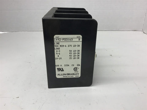 Allen-Bradley 1492-PD3163 Distribution block 400 MCM-6 275 LB-IN 600 Volts Return Policy Returns accepted within 30 days. Items sold as is cannot be returned, unless description is in error. Buyer pays return freight. Shipping Policy We ship almost all items with 1 business day of cleared payment. We ship USPS and UPS. We can ship on your account. If you will be shipping freight, please be sure to provide all delivery contact information including a phone number. We will need to know if you have a fork lift or dock.