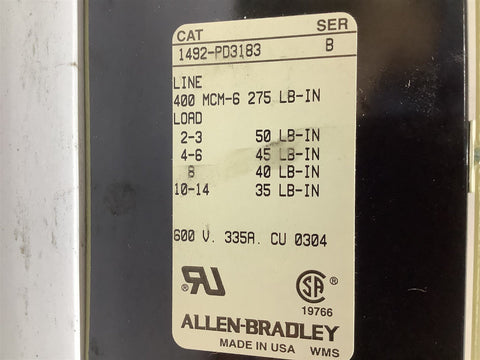 Allen-Bradley 1492-PD3183 Ser B Terminal Block 600 V 335 A Return Policy Returns accepted within 30 days. Items sold as is cannot be returned, unless description is in error. Buyer pays return freight. Shipping Policy We ship almost all items with 1 business day of cleared payment. We ship USPS and UPS. We can ship on your account. If you will be shipping freight, please be sure to provide all delivery contact information including a phone number. We will need to know if you have a fork lift or dock.