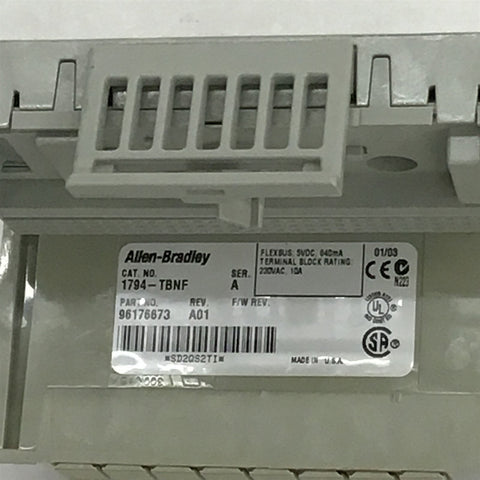 Allen-Bradley 1794-TBNF Ser. A Terminal Block 230 VAC Return Policy Returns accepted within 30 days. Items sold as is cannot be returned, unless description is in error. Buyer pays return freight. Shipping Policy We ship almost all items with 1 business day of cleared payment. We ship USPS and UPS. We can ship on your account. If you will be shipping freight, please be sure to provide all delivery contact information including a phone number. We will need to know if you have a fork lift or dock.