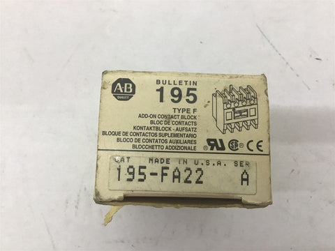 Allen-Bradley F195FA22 Contact Block Return Policy Returns accepted within 30 days. Items sold as is cannot be returned, unless description is in error. Buyer pays return freight. Shipping Policy We ship almost all items with 1 business day of cleared payment. We ship USPS and UPS. We can ship on your account. If you will be shipping freight, please be sure to provide all delivery contact information including a phone number. We will need to know if you have a fork lift or dock.