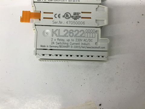 Beckhoff KL2622 230 V AC/DC 2A Relay Return Policy Returns accepted within 30 days. Items sold as is cannot be returned, unless description is in error. Buyer pays return freight. Shipping Policy We ship almost all items with 1 business day of cleared payment. We ship USPS and UPS. We can ship on your account. If you will be shipping freight, please be sure to provide all delivery contact information including a phone number. We will need to know if you have a fork lift or dock.