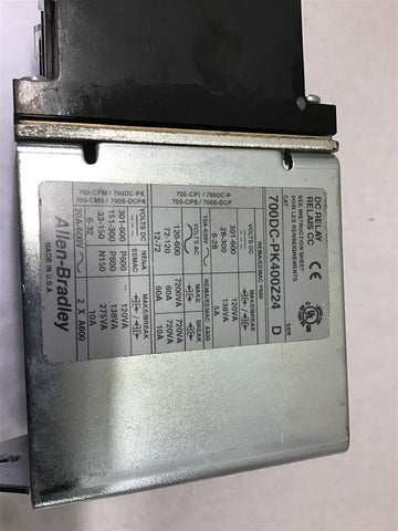 Allen-Bradley 700DC-PK400Z24 DC Control Relay 24 Vdc Coil Return Policy Returns accepted within 30 days. Items sold as is cannot be returned, unless description is in error. Buyer pays return freight. Shipping Policy We ship almost all items with 1 business day of cleared payment. We ship USPS and UPS. We can ship on your account. If you will be shipping freight, please be sure to provide all delivery contact information including a phone number. We will need to know if you have a fork lift or dock.