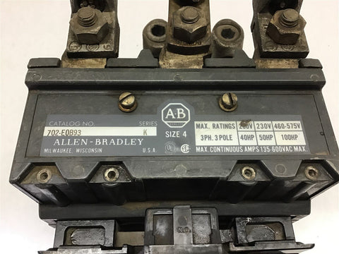 Allen-Bradley 702-E0B93 Ser K Starter 4 Size 480 V Coil Return Policy Returns accepted within 30 days. Items sold as is cannot be returned, unless description is in error. Buyer pays return freight. Shipping Policy We ship almost all items with 1 business day of cleared payment. We ship USPS and UPS. We can ship on your account. If you will be shipping freight, please be sure to provide all delivery contact information including a phone number. We will need to know if you have a fork lift or dock.