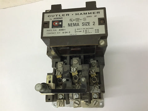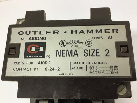 Cutler-Hammer A10DN0 Motor Starter NEMA Size 2 3PH 460/575 V 25 HP 45 Amp Return Policy Returns accepted within 30 days. Items sold as is cannot be returned, unless description is in error. Buyer pays return freight. Shipping Policy We ship almost all items with 1 business day of cleared payment. We ship USPS and UPS. We can ship on your account. If you will be shipping freight, please be sure to provide all delivery contact information including a phone number. We will need to know if you have a fork lift or dock.
