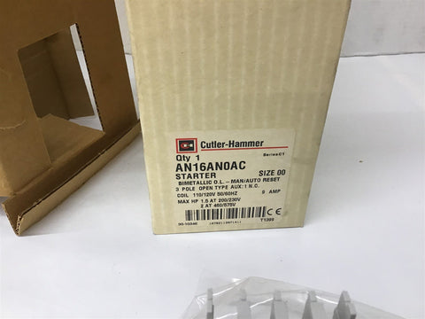 Cutler-Hammer AN16AN0AC Ser. C1 Starter Size 00 3 Pole 9 Amp 110/120 V 50/60 Hz Return Policy Returns accepted within 30 days. Items sold as is cannot be returned, unless description is in error. Buyer pays return freight. Shipping Policy We ship almost all items with 1 business day of cleared payment. We ship USPS and UPS. We can ship on your account. If you will be shipping freight, please be sure to provide all delivery contact information including a phone number. We will need to know if you have a fork lift or dock.