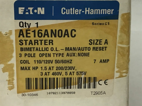 Eaton AE16AN0AC Starter Size A 3 Hp @ 460 Volts 120 volts coil 3 Pole 7 Amp Return Policy Returns accepted within 30 days. Items sold as is cannot be returned, unless description is in error. Buyer pays return freight. Shipping Policy We ship almost all items with 1 business day of cleared payment. We ship USPS and UPS. We can ship on your account. If you will be shipping freight, please be sure to provide all delivery contact information including a phone number. We will need to know if you have a fork lift or dock.