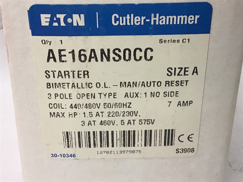 Eaton AE16ANS0CC Size A Starter 3 Hp @ 460 Volts 440/480 volts Coil 3 Pole 7 Amp Return Policy Returns accepted within 30 days. Items sold as is cannot be returned, unless description is in error. Buyer pays return freight. Shipping Policy We ship almost all items with 1 business day of cleared payment. We ship USPS and UPS. We can ship on your account. If you will be shipping freight, please be sure to provide all delivery contact information including a phone number. We will need to know if you have a fork lift or dock.