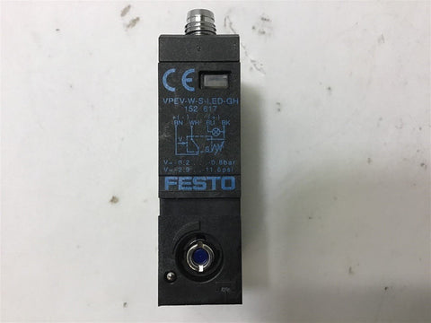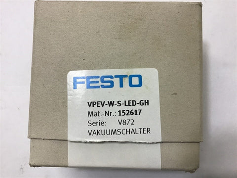 Festo VPEV-W-S-LED-GH Vaccum Switch 152617 ser. V872 Return Policy Returns accepted within 30 days. Items sold as is cannot be returned, unless description is in error. Buyer pays return freight. Shipping Policy We ship almost all items with 1 business day of cleared payment. We ship USPS and UPS. We can ship on your account. If you will be shipping freight, please be sure to provide all delivery contact information including a phone number. We will need to know if you have a fork lift or dock.