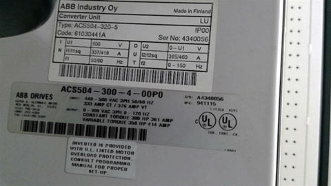 ABB ACS504-300-4-ACS 500 Variable Frequency Drive Type 1 Enclosure 500V 337/418A Return Policy Returns accepted within 30 days. Items sold as is cannot be returned, unless description is in error. Buyer pays return freight. Shipping Policy We ship almost all items with 1 business day of cleared payment. We ship USPS and UPS. We can ship on your account. If you will be shipping freight, please be sure to provide all delivery contact information including a phone number. We will need to know if you have a fork lift or dock.