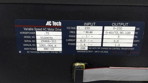 AC Tech V12007D Variable Speed AC Motor Drive .75 HP 230 Volts Return Policy Returns accepted within 30 days. Items sold as is cannot be returned, unless description is in error. Buyer pays return freight. Shipping Policy We ship almost all items with 1 business day of cleared payment. We ship USPS and UPS. We can ship on your account. If you will be shipping freight, please be sure to provide all delivery contact information including a phone number. We will need to know if you have a fork lift or dock.