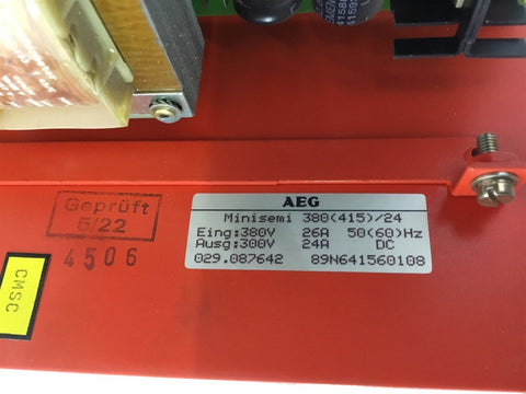 AEG Minisemi 380(480)/24 Power Supply 26 Amp 380 Volt Return Policy Returns accepted within 30 days. Items sold as is cannot be returned, unless description is in error. Buyer pays return freight. Shipping Policy We ship almost all items with 1 business day of cleared payment. We ship USPS and UPS. We can ship on your account. If you will be shipping freight, please be sure to provide all delivery contact information including a phone number. We will need to know if you have a fork lift or dock.