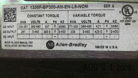 Allen-Bradley 1336F-BP300-AN-EN-L6-NCM Drive 460 Volts 400 HZ 300 HP