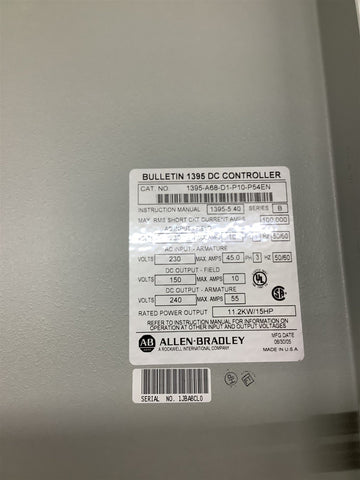 Allen-Bradley 1395 A68D1P10P54EN Bulletin 1395 DC Controller 150/240 DC Output