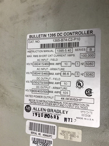 Allen-Bradley 1395-B74-C2-P10 Dc Drive 60 HP 500 Armature Volts