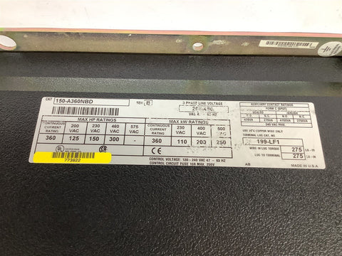 Allen-Bradley 150-A360NBD Smart Motor Controller 250 VAC 10 A Return Policy Returns accepted within 30 days. Items sold as is cannot be returned, unless description is in error. Buyer pays return freight. Shipping Policy We ship almost all items with 1 business day of cleared payment. We ship USPS and UPS. We can ship on your account. If you will be shipping freight, please be sure to provide all delivery contact information including a phone number. We will need to know if you have a fork lift or dock.