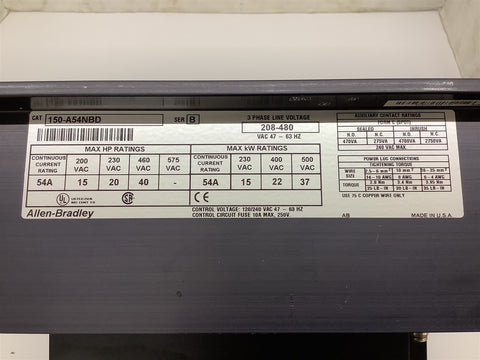 Allen-Bradley 150-A54NBD Motor Controller 208-480 Volts 3 Phase Return Policy Returns accepted within 30 days. Items sold as is cannot be returned, unless description is in error. Buyer pays return freight. Shipping Policy We ship almost all items with 1 business day of cleared payment. We ship USPS and UPS. We can ship on your account. If you will be shipping freight, please be sure to provide all delivery contact information including a phone number. We will need to know if you have a fork lift or dock.