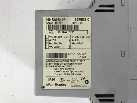 Allen-Bradley 160-BA03NSF1 Drive 1 HP 380-460 Volt Output Return Policy Returns accepted within 30 days. Items sold as is cannot be returned, unless description is in error. Buyer pays return freight. Shipping Policy We ship almost all items with 1 business day of cleared payment. We ship USPS and UPS. We can ship on your account. If you will be shipping freight, please be sure to provide all delivery contact information including a phone number. We will need to know if you have a fork lift or dock.