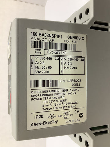 Allen-Bradley 160-BA03NSF1P1 1 Hp AC Speed Controller 460 Volts 2.3 Amp 3 Phase Return Policy Returns accepted within 30 days. Items sold as is cannot be returned, unless description is in error. Buyer pays return freight. Shipping Policy We ship almost all items with 1 business day of cleared payment. We ship USPS and UPS. We can ship on your account. If you will be shipping freight, please be sure to provide all delivery contact information including a phone number. We will need to know if you have a fork lift or dock.