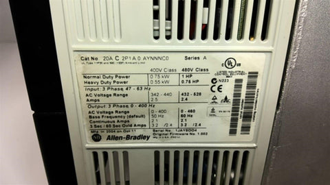 Allen Bradley 20AC2P1A0AYNNNCO AC 1 HP Drive Missing Plate Return Policy Returns accepted within 30 days. Items sold as is cannot be returned, unless description is in error. Buyer pays return freight. Shipping Policy We ship almost all items with 1 business day of cleared payment. We ship USPS and UPS. We can ship on your account. If you will be shipping freight, please be sure to provide all delivery contact information including a phone number. We will need to know if you have a fork lift or dock.