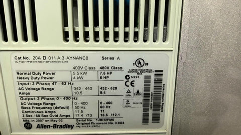 Allen Bradley 20AD011A3AYNANC0 PowerFlex 70 Drive 7.5 Hp 460 Volts