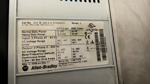 Allen Bradley 20AD040A0AYNANCO 3PH PowerFlex 70 Drive 30 HP 460 Volts Return Policy Returns accepted within 30 days. Items sold as is cannot be returned, unless description is in error. Buyer pays return freight. Shipping Policy We ship almost all items with 1 business day of cleared payment. We ship USPS and UPS. We can ship on your account. If you will be shipping freight, please be sure to provide all delivery contact information including a phone number. We will need to know if you have a fork lift or dock.