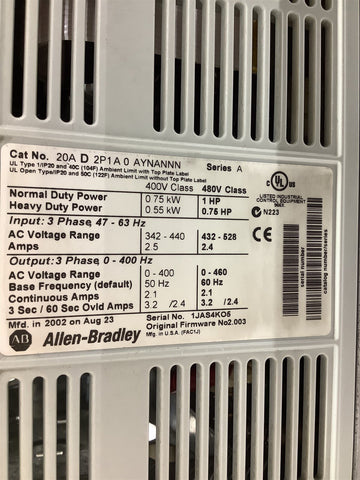 Allen-Bradley 20AD2P1A0AYNANNN Power Flex 70 1 HP Ac Drive 480 volt Return Policy Returns accepted within 30 days. Items sold as is cannot be returned, unless description is in error. Buyer pays return freight. Shipping Policy We ship almost all items with 1 business day of cleared payment. We ship USPS and UPS. We can ship on your account. If you will be shipping freight, please be sure to provide all delivery contact information including a phone number. We will need to know if you have a fork lift or dock.