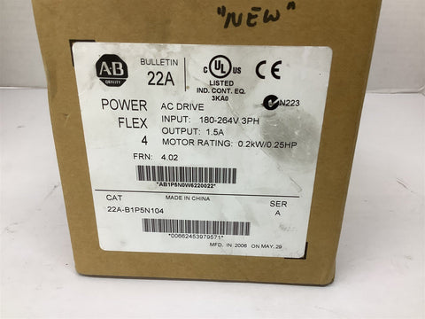 Allen Bradley 22A-B1P5N104 Drive .25 Hp 180-264 V 1.5 A 3 Ph Return Policy Returns accepted within 30 days. Items sold as is cannot be returned, unless description is in error. Buyer pays return freight. Shipping Policy We ship almost all items with 1 business day of cleared payment. We ship USPS and UPS. We can ship on your account. If you will be shipping freight, please be sure to provide all delivery contact information including a phone number. We will need to know if you have a fork lift or dock.