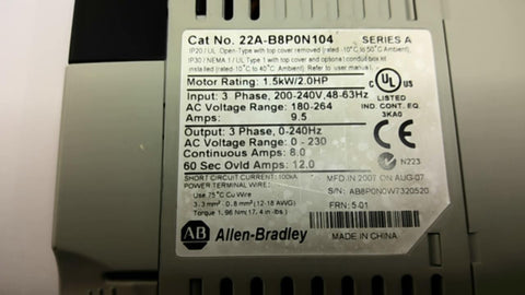 Allen Bradley 22A-B8P0N104 PowerFlex 4 Drive 2 hp 230 Volts 3 Phase Return Policy Returns accepted within 30 days. Items sold as is cannot be returned, unless description is in error. Buyer pays return freight. Shipping Policy We ship almost all items with 1 business day of cleared payment. We ship USPS and UPS. We can ship on your account. If you will be shipping freight, please be sure to provide all delivery contact information including a phone number. We will need to know if you have a fork lift or dock.