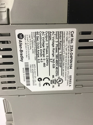 Allen-Bradley 22A-D4P0N104 2 Hp AC Drive 3 Phase 460 Volts 4.0 Amps Return Policy Returns accepted within 30 days. Items sold as is cannot be returned, unless description is in error. Buyer pays return freight. Shipping Policy We ship almost all items with 1 business day of cleared payment. We ship USPS and UPS. We can ship on your account. If you will be shipping freight, please be sure to provide all delivery contact information including a phone number. We will need to know if you have a fork lift or dock.