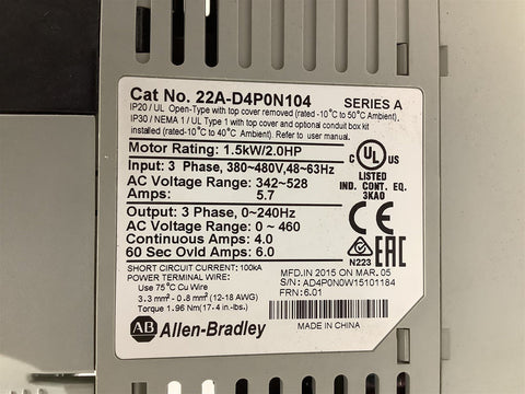 Allen-Bradley 22A-D4P0N104 2 Hp AC Drive 460 volts