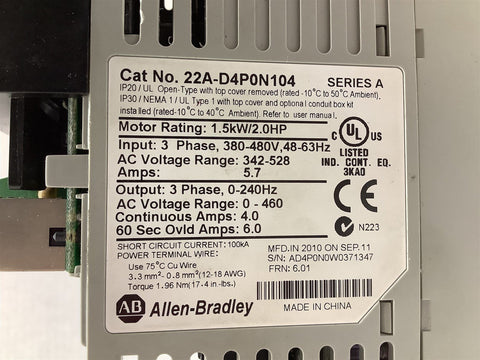 Allen-Bradley 22A-D4P0N104 AC Drive 2 HP 460 V 3 PH 4 Amps Return Policy Returns accepted within 30 days. Items sold as is cannot be returned, unless description is in error. Buyer pays return freight. Shipping Policy We ship almost all items with 1 business day of cleared payment. We ship USPS and UPS. We can ship on your account. If you will be shipping freight, please be sure to provide all delivery contact information including a phone number. We will need to know if you have a fork lift or dock.
