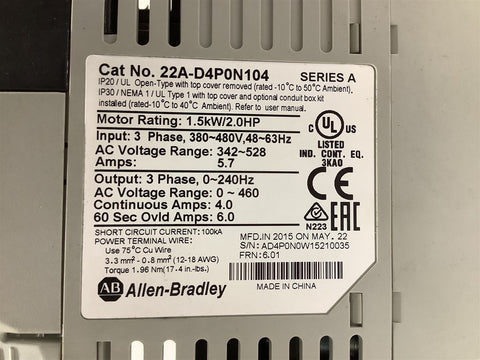 Allen-Bradley 22A-D4P0N104 Ac Drive 2 Hp 460 Volts Return Policy Returns accepted within 30 days. Items sold as is cannot be returned, unless description is in error. Buyer pays return freight. Shipping Policy We ship almost all items with 1 business day of cleared payment. We ship USPS and UPS. We can ship on your account. If you will be shipping freight, please be sure to provide all delivery contact information including a phone number. We will need to know if you have a fork lift or dock.