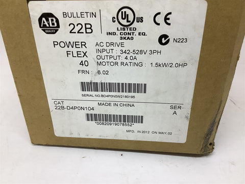 Allen Bradley 22B-D4P0N104 Drive 2 Hp 342-528 V 4 A 3 Ph