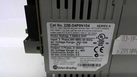 Allen Bradley 22B-D4P0N104 Power Flex 2 HP 3 Phase 380-480Volt 48-63 Hz