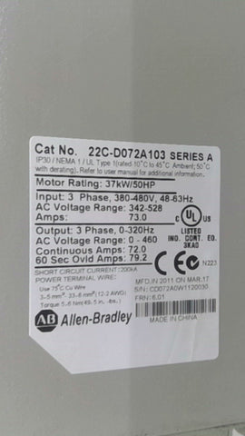 Allen Bradley 22C-D072A103 PowerFlex 400 Drive 37kW/50HP 460 Volts Return Policy Returns accepted within 30 days. Items sold as is cannot be returned, unless description is in error. Buyer pays return freight. Shipping Policy We ship almost all items with 1 business day of cleared payment. We ship USPS and UPS. We can ship on your account. If you will be shipping freight, please be sure to provide all delivery contact information including a phone number. We will need to know if you have a fork lift or dock.