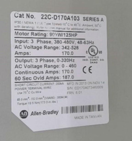 Allen Bradley 22C-D170A103 PowerFlex 400 AC Drive 125 HP