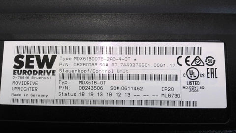 HZ W/ SEW MDX161B0075-2A3-4-OT Drive Inverter--Used--Good Visual Condition--6-25--JLV--