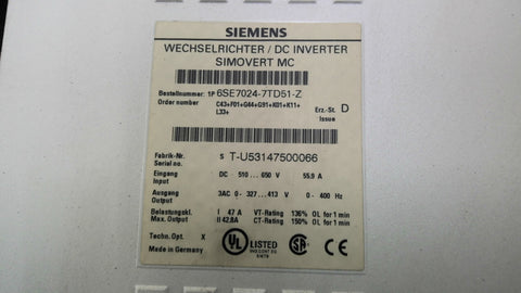 Siemens 1P6SE7024-7TD51-Z DC Inverter 650 Vdc 3 Phase 400 HZ Return Policy Returns accepted within 30 days. Items sold as is cannot be returned, unless description is in error. Buyer pays return freight. Shipping Policy We ship almost all items with 1 business day of cleared payment. We ship USPS and UPS. We can ship on your account. If you will be shipping freight, please be sure to provide all delivery contact information including a phone number. We will need to know if you have a fork lift or dock.