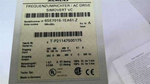 Siemens 6SE7016-1EA61-Z AC Drive Simovert VC Return Policy Returns accepted within 30 days. Items sold as is cannot be returned, unless description is in error. Buyer pays return freight. Shipping Policy We ship almost all items with 1 business day of cleared payment. We ship USPS and UPS. We can ship on your account. If you will be shipping freight, please be sure to provide all delivery contact information including a phone number. We will need to know if you have a fork lift or dock.
