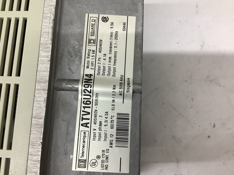 Telemecanique ATV16U29N4 Missing Cover Return Policy Returns accepted within 30 days. Items sold as is cannot be returned, unless description is in error. Buyer pays return freight. Shipping Policy We ship almost all items with 1 business day of cleared payment. We ship USPS and UPS. We can ship on your account. If you will be shipping freight, please be sure to provide all delivery contact information including a phone number. We will need to know if you have a fork lift or dock.