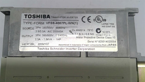 Toshiba VFS9-4007PL-WN Transistor Inverter 1 HP 2.3 Amp 380/500 Volts Return Policy Returns accepted within 30 days. Items sold as is cannot be returned, unless description is in error. Buyer pays return freight. Shipping Policy We ship almost all items with 1 business day of cleared payment. We ship USPS and UPS. We can ship on your account. If you will be shipping freight, please be sure to provide all delivery contact information including a phone number. We will need to know if you have a fork lift or dock.