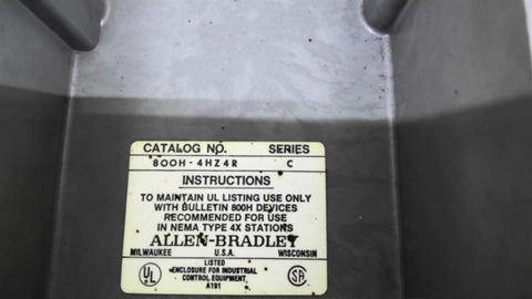 Allen-Bradley 800H-4HZK Pushbutton Enclosure Return Policy Returns accepted within 30 days. Items sold as is cannot be returned, unless description is in error. Buyer pays return freight. Shipping Policy We ship almost all items with 1 business day of cleared payment. We ship USPS and UPS. We can ship on your account. If you will be shipping freight, please be sure to provide all delivery contact information including a phone number. We will need to know if you have a fork lift or dock.