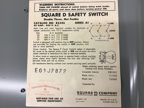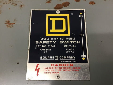 Square D 83242 Double Throw Safety Switch 60 Amps 600 VAC Return Policy Returns accepted within 30 days. Items sold as is cannot be returned, unless description is in error. Buyer pays return freight. Shipping Policy We ship almost all items with 1 business day of cleared payment. We ship USPS and UPS. We can ship on your account. If you will be shipping freight, please be sure to provide all delivery contact information including a phone number. We will need to know if you have a fork lift or dock.