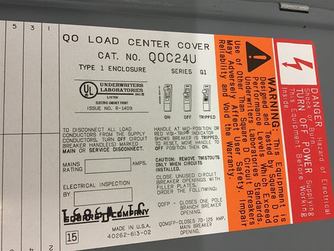 Square D QOc24U Load Center Cover Type 1 Return Policy Returns accepted within 30 days. Items sold as is cannot be returned, unless description is in error. Buyer pays return freight. Shipping Policy We ship almost all items with 1 business day of cleared payment. We ship USPS and UPS. We can ship on your account. If you will be shipping freight, please be sure to provide all delivery contact information including a phone number. We will need to know if you have a fork lift or dock.