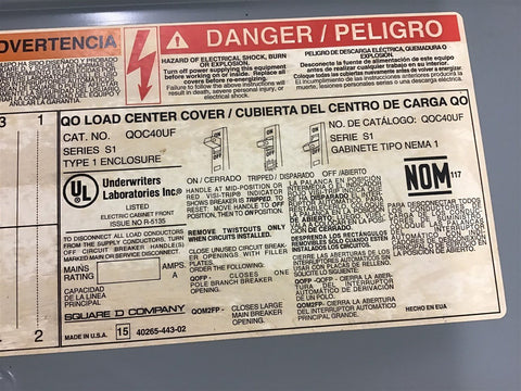 Square D QOC40UF Load Center Cover Return Policy Returns accepted within 30 days. Items sold as is cannot be returned, unless description is in error. Buyer pays return freight. Shipping Policy We ship almost all items with 1 business day of cleared payment. We ship USPS and UPS. We can ship on your account. If you will be shipping freight, please be sure to provide all delivery contact information including a phone number. We will need to know if you have a fork lift or dock.