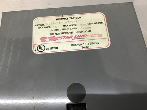 Star Line CBPB-15-1-250-4 Busway Tap Box 15AMPS 250V Return Policy Returns accepted within 30 days. Items sold as is cannot be returned, unless description is in error. Buyer pays return freight. Shipping Policy We ship almost all items with 1 business day of cleared payment. We ship USPS and UPS. We can ship on your account. If you will be shipping freight, please be sure to provide all delivery contact information including a phone number. We will need to know if you have a fork lift or dock.