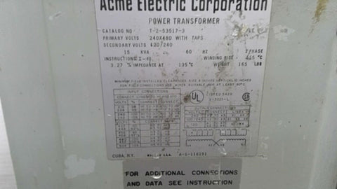 Acme Electric Corp. T2535173 Transformer 240X480V 120/240V 15KVA 1PH Return Policy Returns accepted within 30 days. Items sold as is cannot be returned, unless description is in error. Buyer pays return freight. Shipping Policy We ship almost all items with 1 business day of cleared payment. We ship USPS and UPS. We can ship on your account. If you will be shipping freight, please be sure to provide all delivery contact information including a phone number. We will need to know if you have a fork lift or dock.