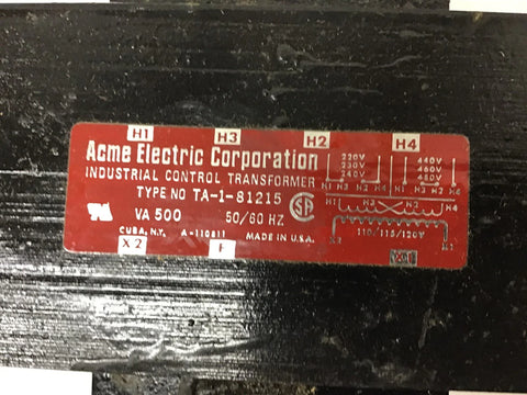 Acme Electric TA-1-81215 Industrial Control Transformer 240/480 V 50/60 Hz 1 PH Return Policy Returns accepted within 30 days. Items sold as is cannot be returned, unless description is in error. Buyer pays return freight. Shipping Policy We ship almost all items with 1 business day of cleared payment. We ship USPS and UPS. We can ship on your account. If you will be shipping freight, please be sure to provide all delivery contact information including a phone number. We will need to know if you have a fork lift or dock.