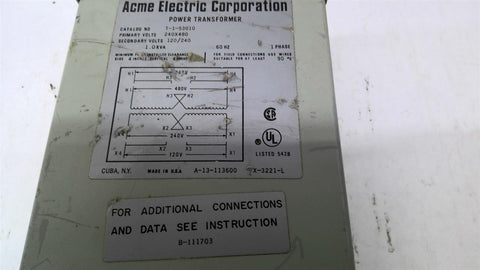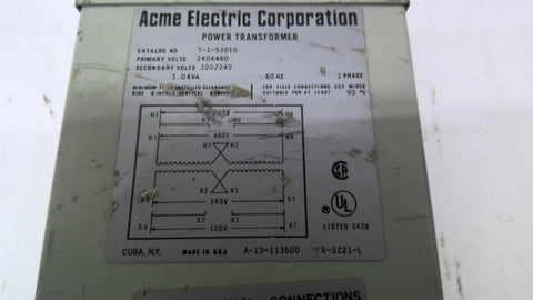 Acme T-1-53010 Transformer 1 KVAPrimary 240x480v Secondary 120/240 Single Phase